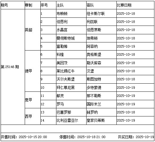 收敛国度队比赛日,五大联赛重燃战火。周六传足赢输彩25146期两场重头戏引东谈主矜恤:德甲迎来国度德比,拜仁主场迎战多特蒙德;意甲强强对话,罗马主场大战外洋米兰。其他值得细心的还有英超曼城对阵埃弗顿,阿森纳则在德比中客形态对富勒姆。