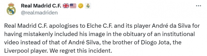 皇家马德里足球俱乐部就机构牵记视频中误将埃尔切足球俱乐部球员安德烈·达·席尔瓦的画面纳入(该画面本应为利物浦球员迪奥戈·若塔的伯仲安德烈·席尔瓦),向埃尔切俱乐部及安德烈·达·席尔瓦本东谈主致歉。咱们对此事深表歉意。