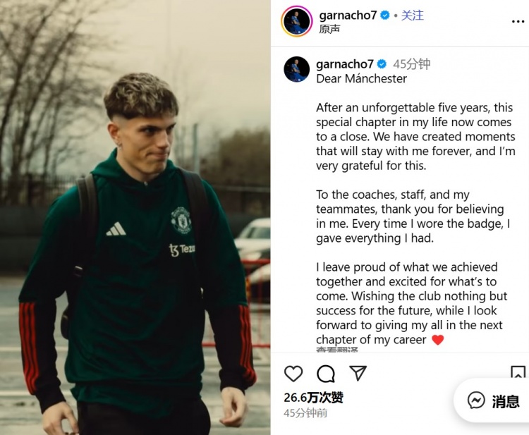 9月1日讯 在持重转会切尔西后,加纳乔更新外交媒体告别了曼联。