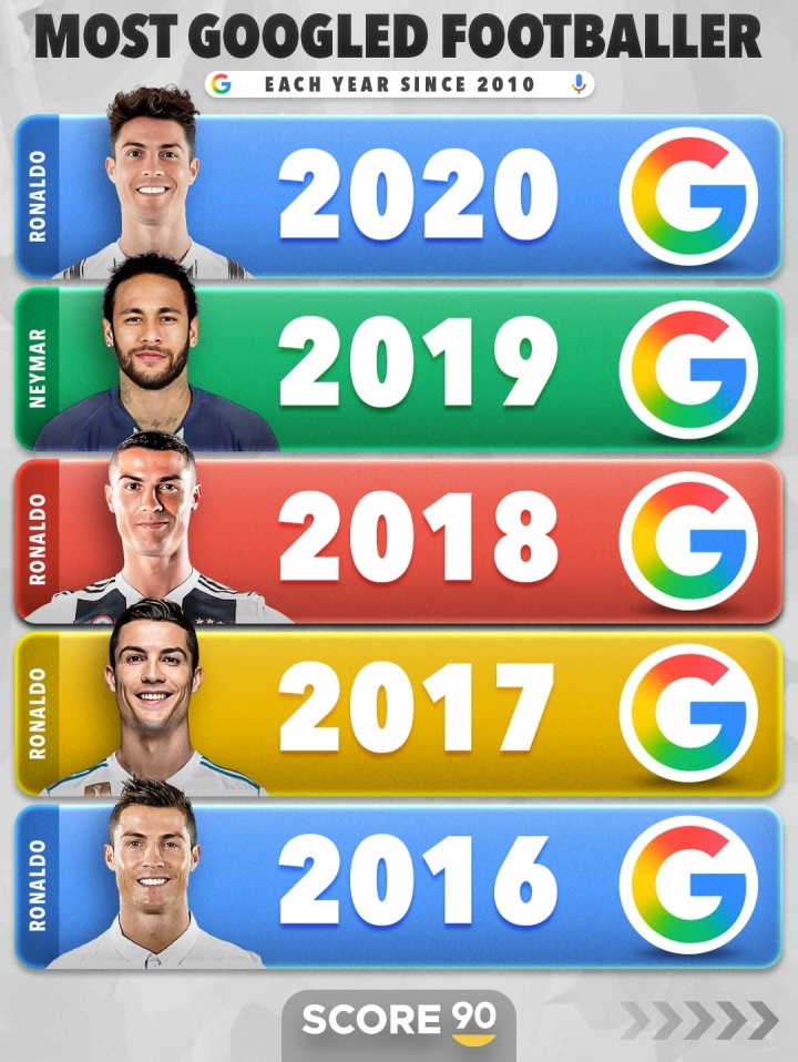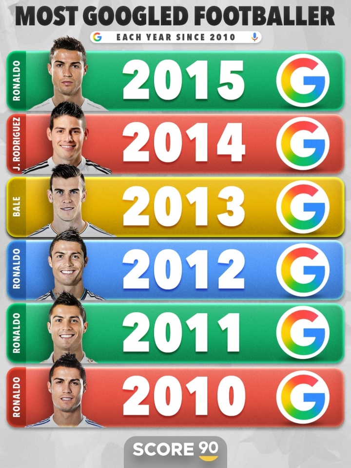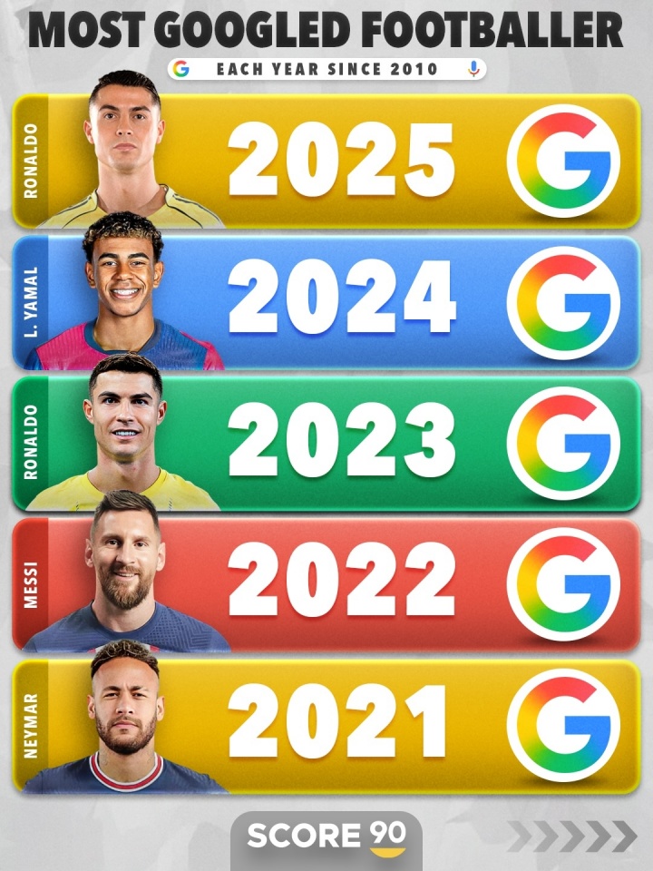 12月01日讯 Score90统计了近十五年谷歌搜索量最多的球员,C罗是当今足坛2025年谷歌搜索量第一东谈主,近15年C罗10次登顶。