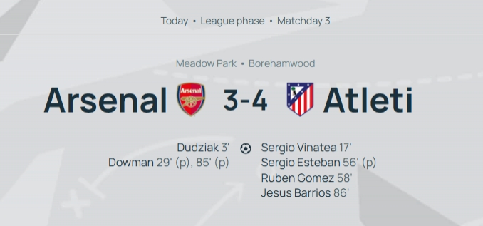 阿森纳一度2-1跨越直到下半场,但马竞后生军在56-58分钟时3分钟内连入两球反超,谈曼第85分钟点射扳平后不到1分钟,马竞再度破门将比分锁定为3-4。