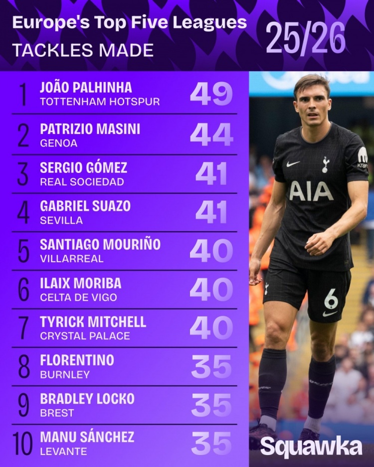 11月21日讯 Squawka统计了本赛季球员在五大联赛奏效抢断的次数,并排出榜单,帕利尼亚49次居首。