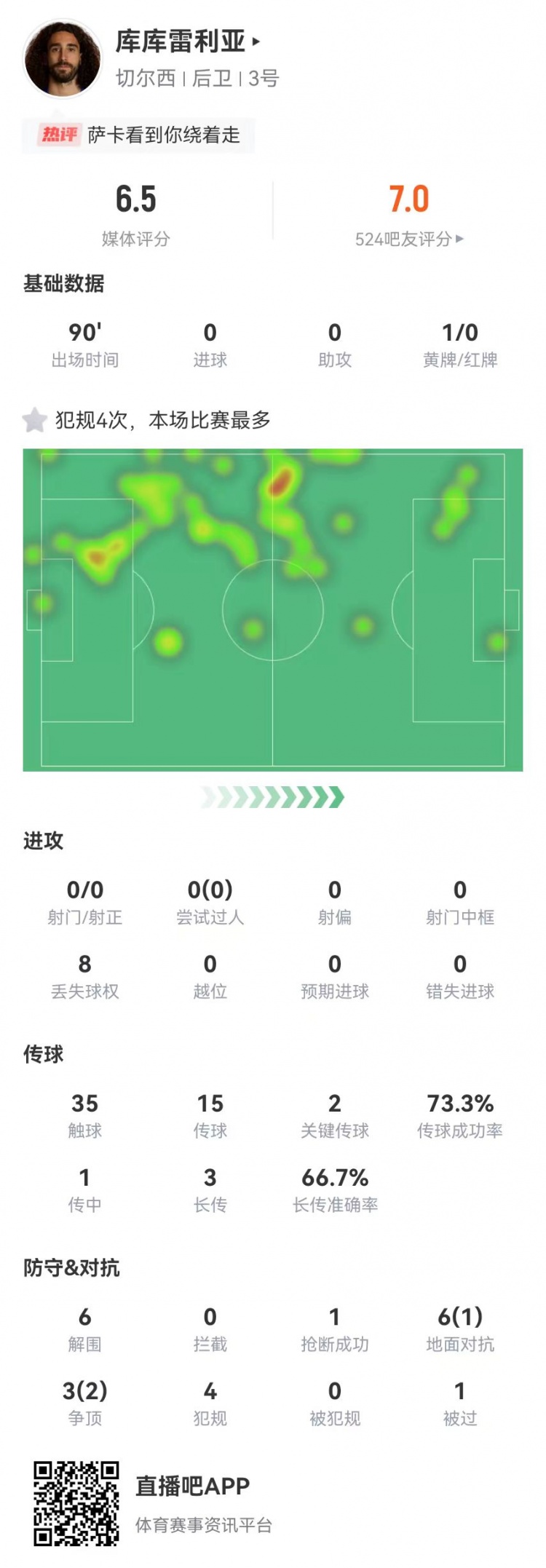 12月1日讯 切尔西在本轮英超对阵阿森纳,库库雷利亚本场数据如下: