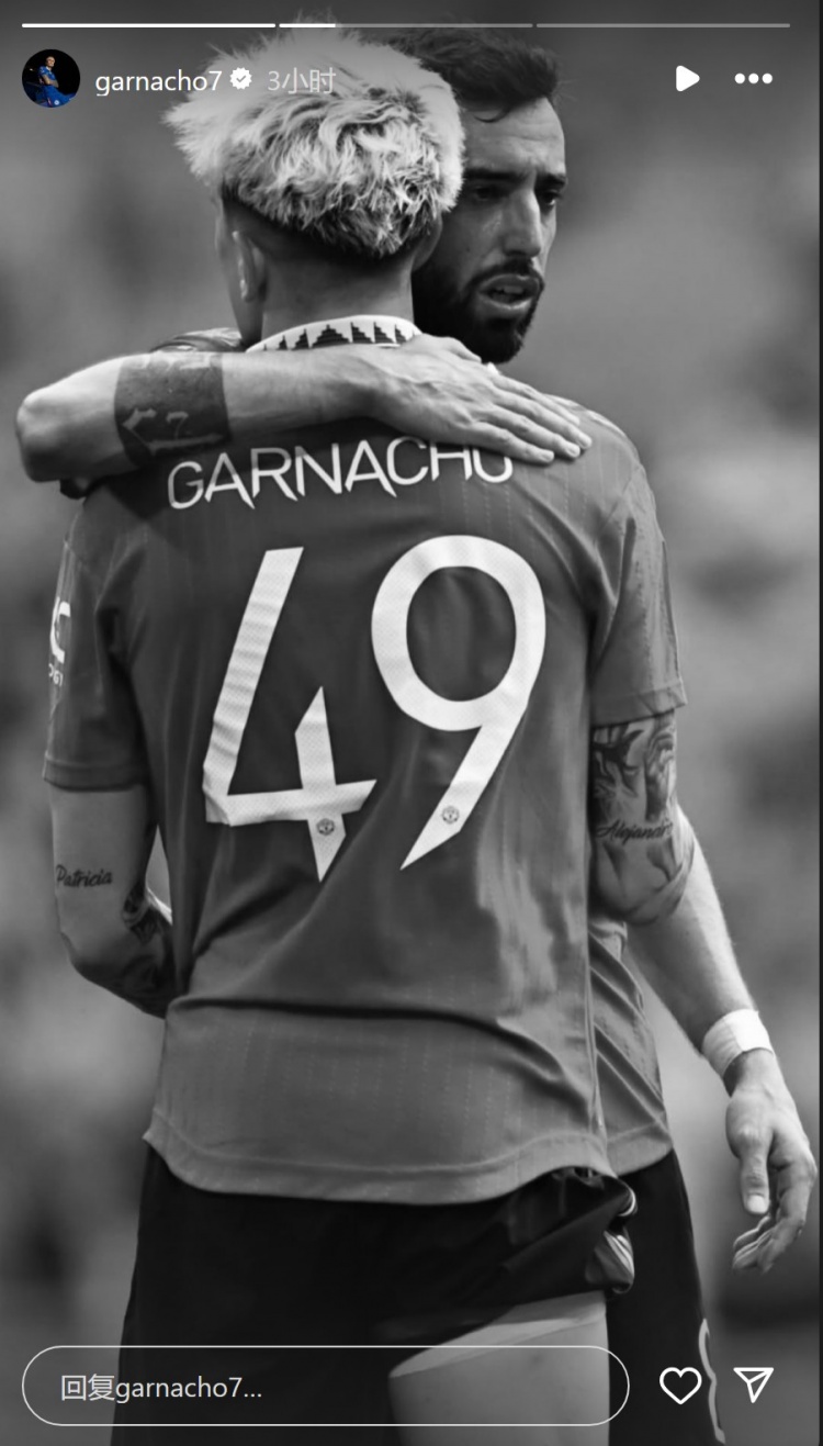 加纳乔社媒晒出我方与前队友B费的赛场面照,其时他身穿曼联49号球衣。