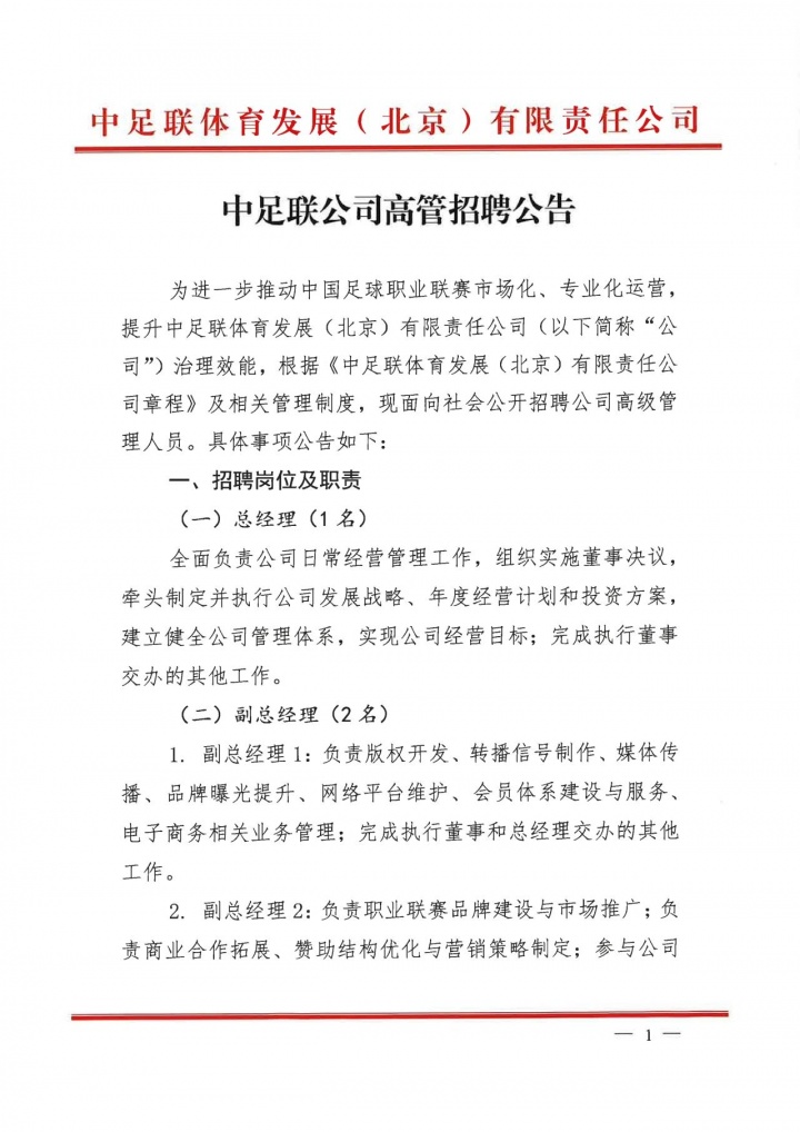 10月09日讯 中国足球事业联赛勾通会发布高管招聘公告,招聘岗亭为总司理(1名)、副总司理(2名)。