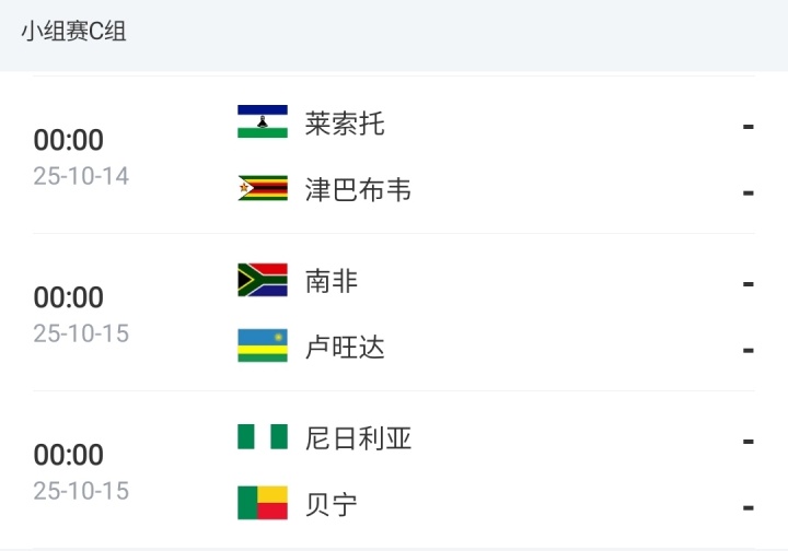 当今C组积分榜上,贝宁2分领跑;南非因派出非法球员,对阵莱索托的比赛被判0-3负,随后又遭垫底队逼平,当今过时2分;坐拥奥斯梅恩、卢克曼、伊沃比等名将的尼日利亚过时3分。