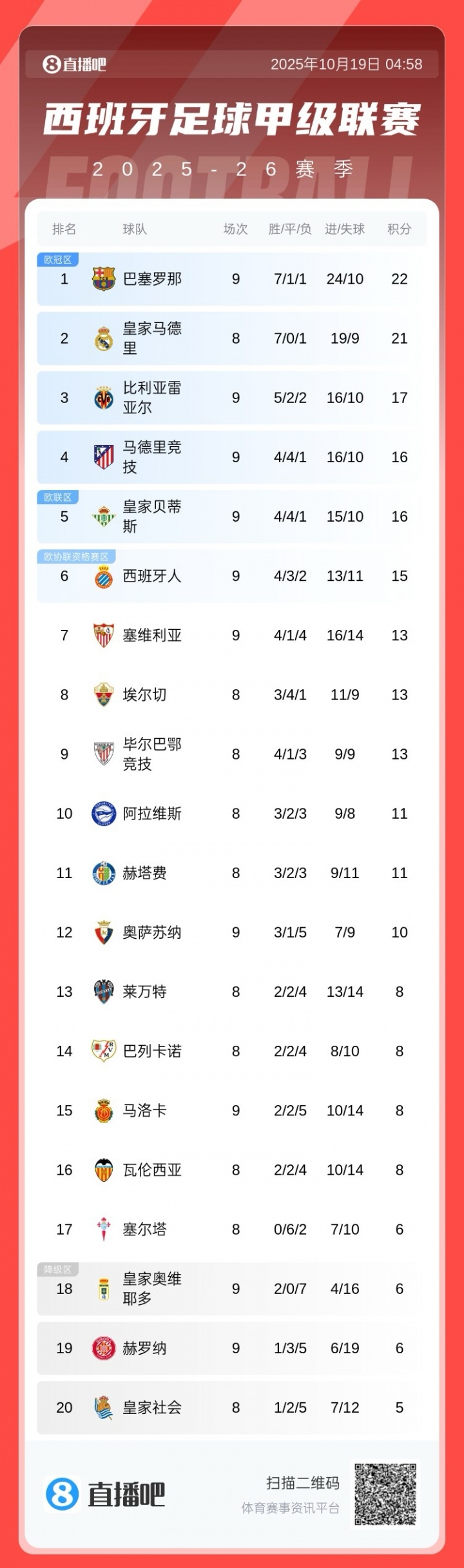 10月19日讯 西甲第9轮,巴萨2-1绝杀赫罗纳,贝蒂斯客场2-2绝平黄潜,马竞1-0奥萨苏纳,最新积分榜如下:
