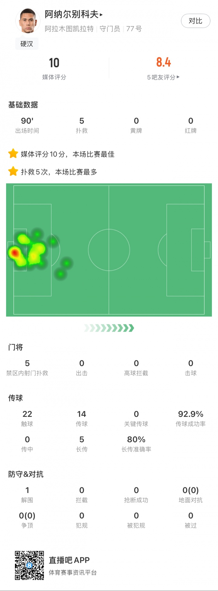 10月22日讯 欧冠联赛阶段第3轮,阿拉木图凯拉特主场0-0战平十东说念主帕福斯,主队的哈萨克斯坦门将阿纳尔别科夫5次扑救获评10分满分!
