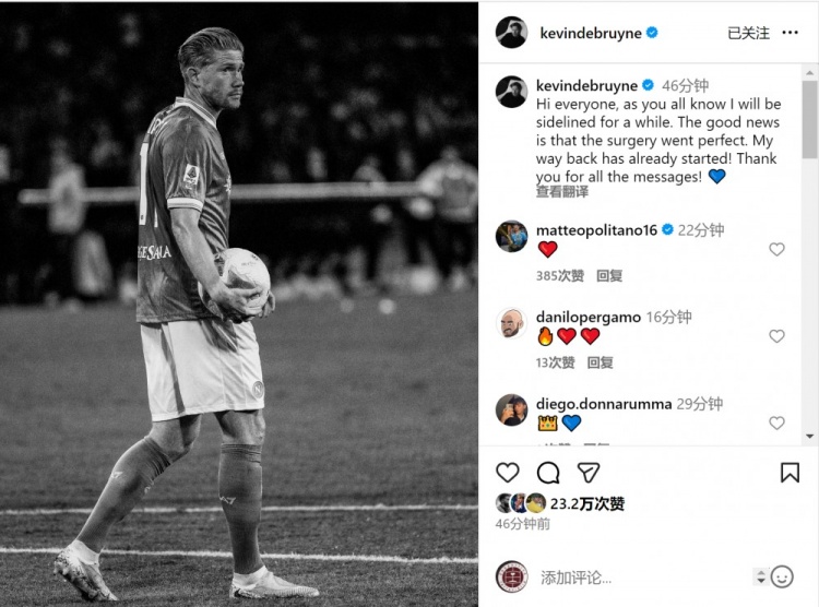 德布劳内在那不勒斯对阵国米的比赛中遭受大腿股二头肌重度挫伤,他在外交媒体上写谈:“全球好,正如你们所知,我将缺阵一段技能。好音问是手术终点得胜,我的康复之路也曾开启!感谢全球的道贺!”