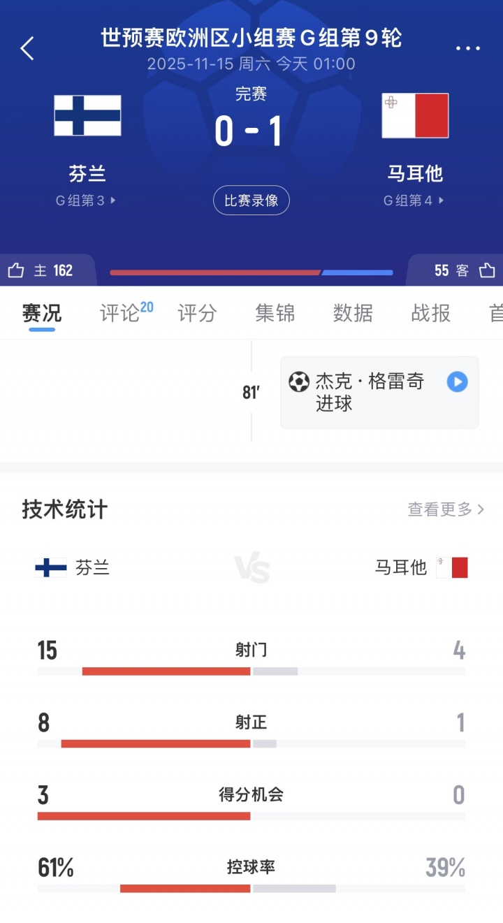 此前马耳他在本届世初赛中2平4负,未曾一胜,此役他们在第82分钟冲突僵局,杰克·格雷奇替补破门匡助马耳他1-0爆冷胜出,这是他们自1993年以来第3场世初赛见效,同期也送芬兰提前无缘宇宙杯。