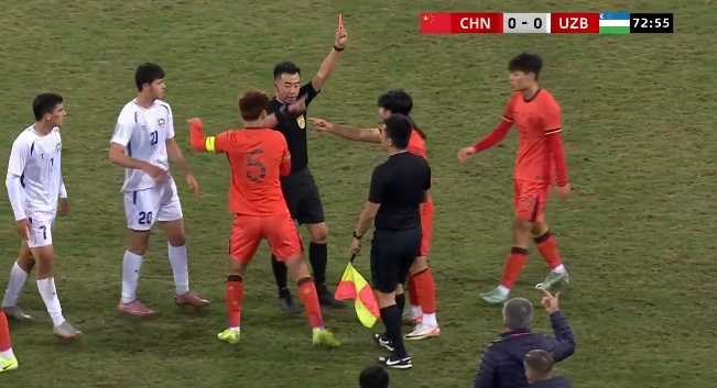 11月18日讯 熊猫杯第3轮,中国U22男足vs乌兹别克斯坦U22男足,比赛第73分钟,汪士钦拉拽敌手犯规,随后向前怒推倒地的敌手,裁判平直出示红牌将其罚下,U22国足少打一东说念主。