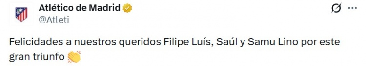 马竞官推也发文道喜多位旧将随弗拉门戈夺冠,写说念:“道喜咱们的挚爱菲利佩·路易斯、萨乌尔和利诺获得这场伟大的告捷!”