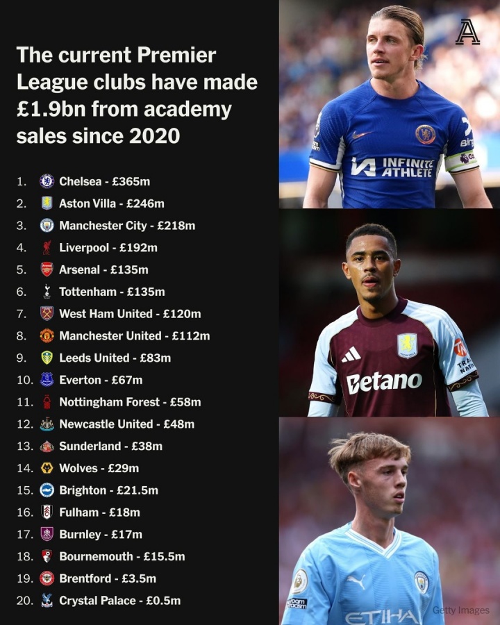 08月22日讯 TA统计了自2020年以来,英超20队的青训球员出售情况,切尔西3.65亿断档第1。