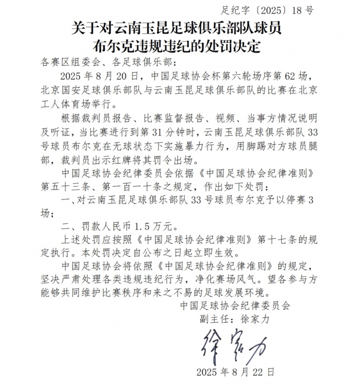 值得一提的是,此前云南玉昆官方发布公告,示意布尔克举止损伤球队利益,处以10万罚金。因此布尔克因为这张红牌共计被罚了11.5万元。