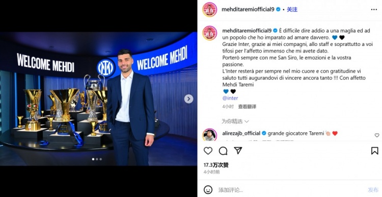 “国外米兰将恒久留在我心中。带着感恩之情,我向你们统共东谈主告别,并祝颂你们将来获取更多荣誉!满怀心境地这样作念。——梅赫迪-塔雷米。”