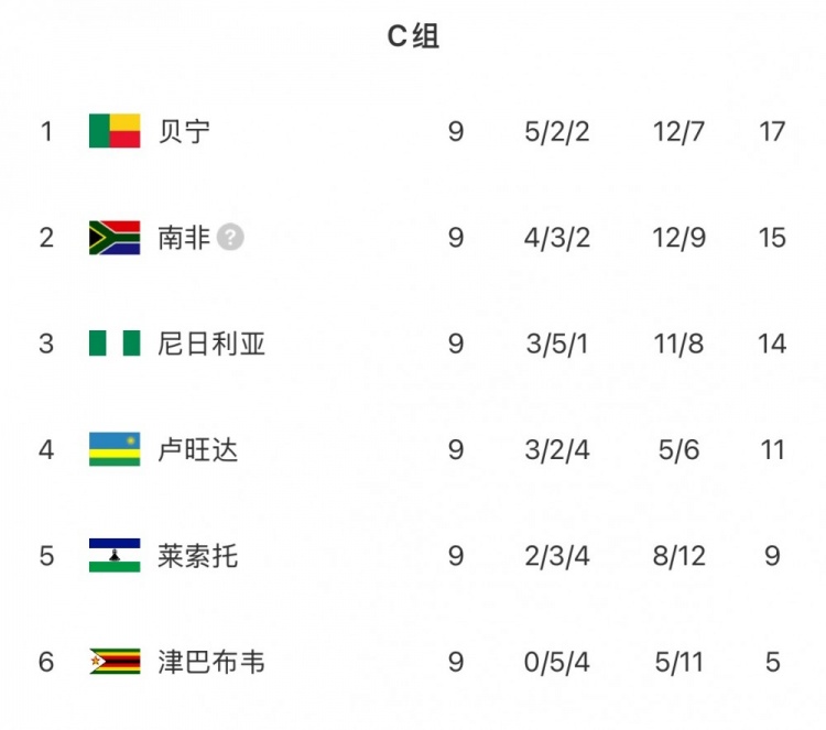 9轮事后,贝宁以17分领跑C组,卓绝第二名南非2分,第三尼日利亚3分。