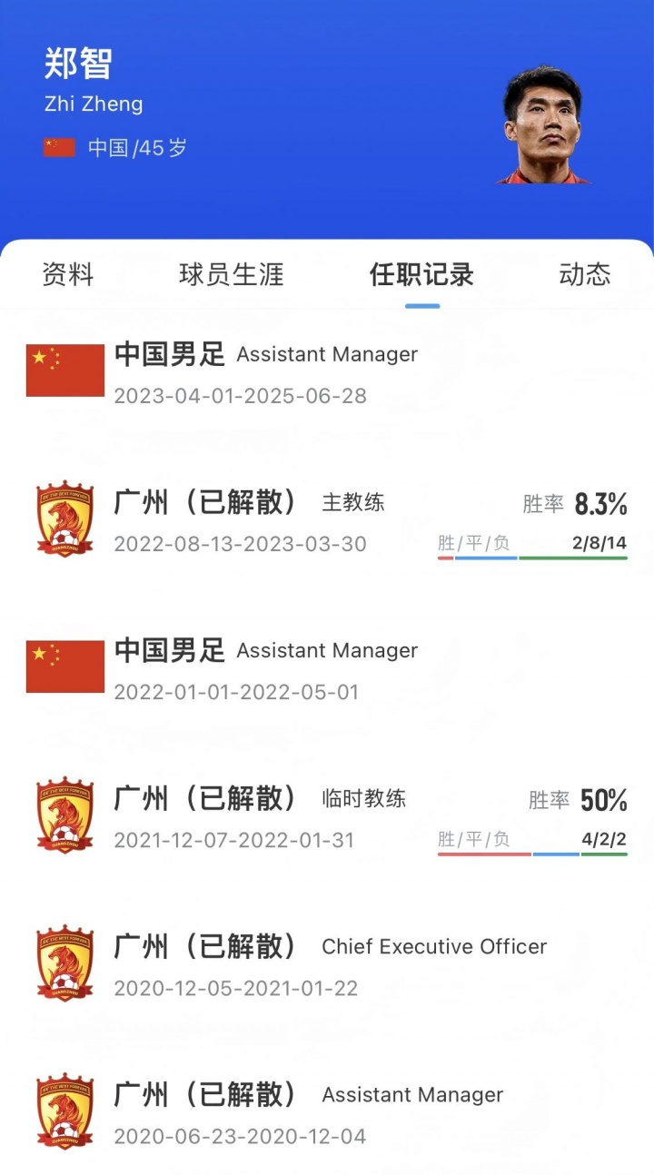 2021年12月7日,郑智出任广州队奉行主教师兼球员。2022年1月,41岁的郑智出战广州队vs长春亚泰的中超比赛,这是他劳动生计终末一次出场。2022年8月,郑智出任广州队主教师。 2023年2月27日,郑智出任国足助教 。跟着伊万离任,郑智也退放洋足助教团队。