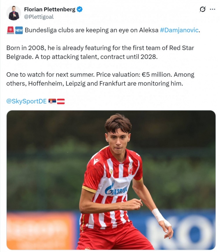 普莱滕伯格指出,16岁前卫达姆贾诺维奇还是为红星一线队出场,他与俱乐部的条约2028年到期。这位小将明夏的动向值得热心,球员估价500万欧元,霍芬海姆、莱比锡、法兰克福等俱乐部王人在热心球员。