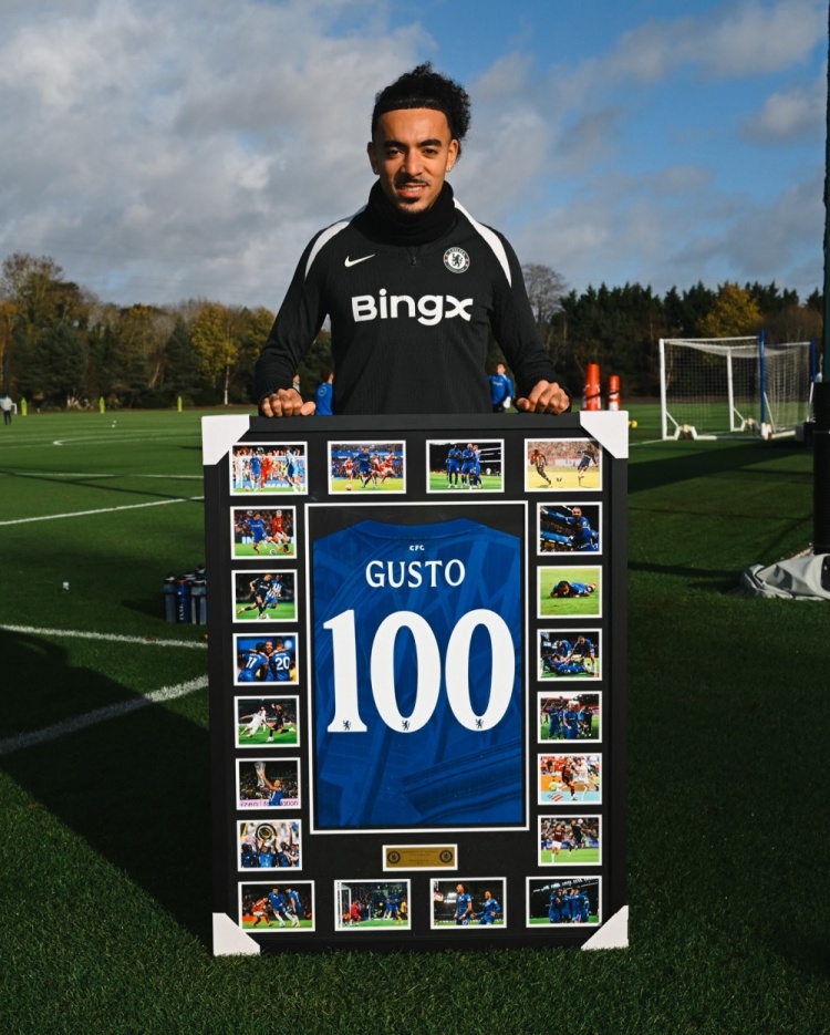 此役是古斯托为切尔西出战的第100场比赛,他共计打进1球,助攻14次。古斯托获赠蓝军糊口百场驰念球衣,切尔西社媒晒出他与驰念球衣的合照。